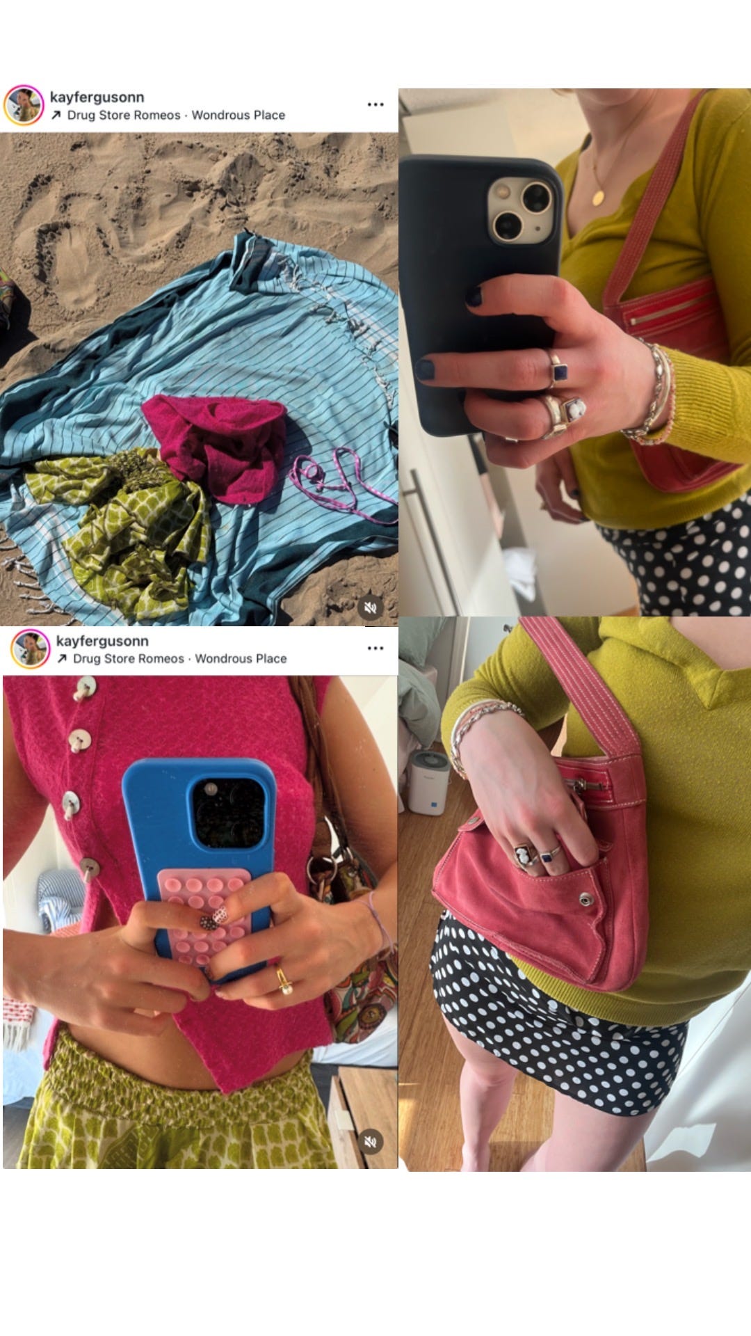 Every time I get ready for anything I feel like I have nothing to wear which is not true because my closet is so full. So I have been playing a lot of dress up in my closet each week where I try on a bunch of outfits and wear my clothes in different ways for an hour, and I want to share the things I come up with so you guys can play Smash or Pass. Starting off easy with this pic of all my new thrift finds, you alr know I’ve been searching for this green and pink combo for spring/summer. My fav style icon on instagram right now is Kay Ferguson (@Kayfergusonn). Her outfits are so cool. She just was at the beach wearing green and pink which was the inspiration for my thrift finds yesterday. Here’s us side by side